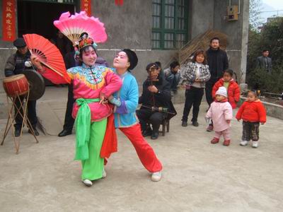 一旦一丑表演,用手巾和折扇作道具。旦的表演含蓄細膩,動作優(yōu)美輕俏,以眉目傳情(脧眉眼)為特點。丑的表演活潑聰明,俏皮逗樂,動作粗獷。流傳在境內的地花鼓有“洗菜心”、“銅錢歌”、“望郎歌”等。