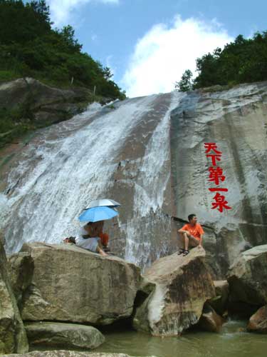 水簾瀑布源頭,在紫蓋峰的泉水。三支泉水匯集一起,流入水簾上方谷地。谷地闊三丈,原是梁朝的九位真人白日飛升的棲息之地,后建造九仙觀。九仙觀附近有太陽泉、洗心泉、真源、仙人池等。相傳泉水深不可測。泉水從石壁上飛流直瀉,發(fā)出雷鳴般的聲音,聲傳十里。明朝張居正游此地后說:“瀑泉灑落,水簾數(shù)疊,掛于云際,垂如貫珠,霏如削玉”。確實,它從絕壁上噴瀉下來,寬達三太,高五十余米,瀉珠濺玉,仿佛一幅巨大的白布簾,在石壁當中被亂石嶙巖擋住,然后再從石縫里屈曲折射,跳躍出來,滿谷水花四濺,閃爍著晶瑩奪目的光彩。水簾絕壁下的碧潭,天上的云彩和兩邊的蒼翠的山巒,構成一幅美麗的山水畫。明朝張居正作《水簾》一贊道:“誤疑瀛海翻瓊浪,莫擬銀河倒碧流;自是湘妃深隱處,水晶簾掛五去頭”。這首詩可說是寫出了水簾的光、聲、影三絕的奇景了。