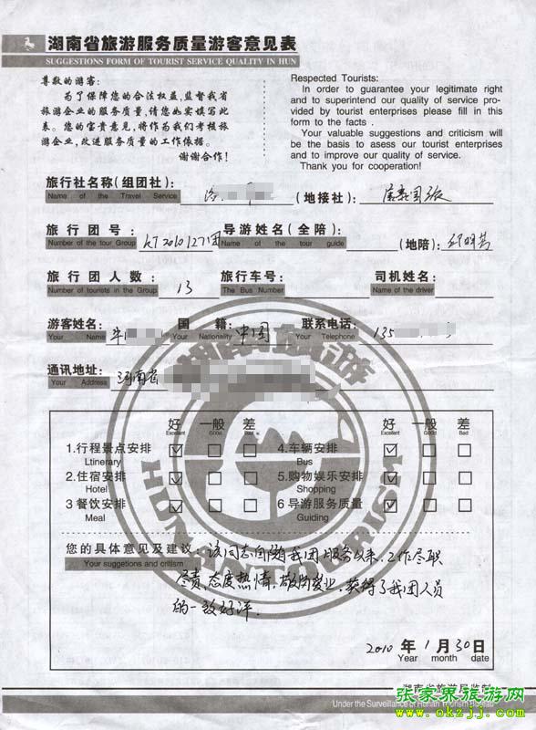 2010年1月27日河南牛先生一行13人旅游接待質(zhì)量反饋單
