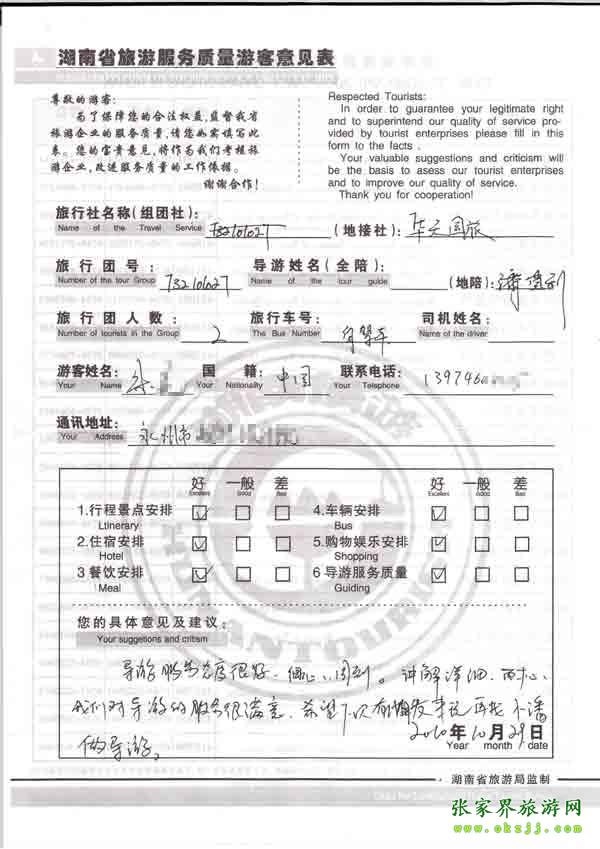 2010年10月29號永州朱先生一行兩位旅游質(zhì)量反饋:對導(dǎo)游很滿意,下次來還找她