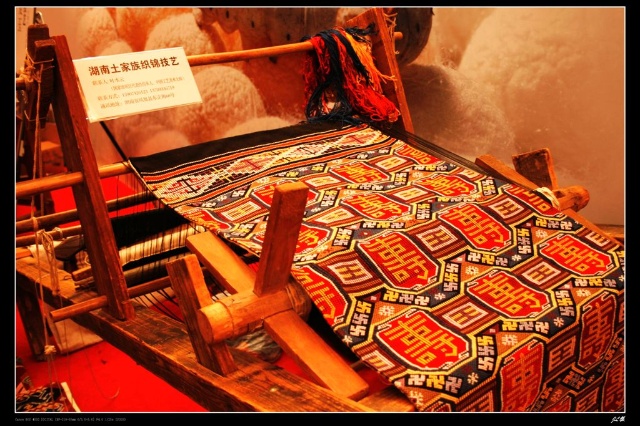 土家織錦,就是土家姑娘用一種古老的木腰機,以棉紗為經,對五彩絲線或棉線(當今也有用毛線)為緯,完全用手工織成的手工藝術品。土家織錦的藝術品種,經過一兩千年的演變,現(xiàn)在已發(fā)展到100多個,除原有的“西蘭卡普”(即被面花)以外,又根據(jù)時代的變化織出了各種圖案的壁掛、香袋、服飾、旅游袋、沙發(fā)套、坐墊、地毯、室內裝飾等多種工藝美術品。聰明的土家姑娘,她們心靈手巧,表現(xiàn)山水,表現(xiàn)人物,表現(xiàn)樹木花卉與飛禽走獸,形象逼真,栩栩如生。 土家織錦產區(qū)主要分布在龍山縣苗兒灘、張家界、撈車及靛房、坡腳;永順縣縣對山、風棲;保靖縣的普絨、清水等地。春秋戰(zhàn)國時期,“表布”(即土家錦)即已成為貢品。