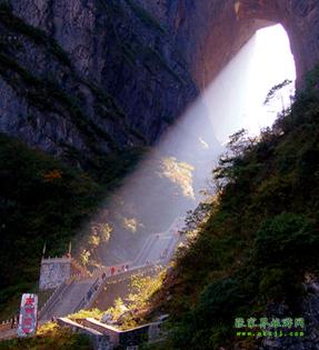 中國最高的自然“天門洞” 公元263年即三國吳永安永安六年時,吳王孫休見其高峻雄偉,巍峨壯觀,便將武陵郡分置天門郡,從此天門冊名傳遐邇,譽貫古今。天門洞周圍簇涌著丹灶,老僧、玉壺、玉堂、金匱、筆架、將軍、箭桿、漆圓、弩牙、猿點、天姥、負兒、簸箕、雞籠、高遠等16座山峰,其間又鑲嵌著雷、電、風、云、泥、蛇、龜、祖師、玉皇、鬼谷、果老、玄天、合山、求兒、鐘鼓、老龍等16洞府,幽默盤亙,使得天門山在雄偉之中又增添了神奇和秀麗。流水清洌的澧河為天門山頻映倒影,寬廣低平的田疇為其鋪就如茵綠毯,繁茂的森林裝點著山基和山頂,淡云薄霧為她峨冠霞佩,朝暉夕照為她斜染紅裝。隨著四季的更替,她春茵夏碧秋金冬縞,呈現(xiàn)出無窮的變幻。天門山生態(tài)系統(tǒng)給天門洞的神奇增添了新的魅力。 據(jù)說,天門洞開景區(qū)的有上天梯。有著九百九十九級臺階的上天梯!
