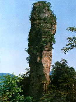 [南天一柱] 過南天門120米,東南幽谷峰林中有一高達(dá)200多米的孤峰,宛如擎天玉柱。上部灌木點綴,中部巖身赤裸,下部樹木遮掩,峰體渾圓、偉岸,因立南天門下而得名。