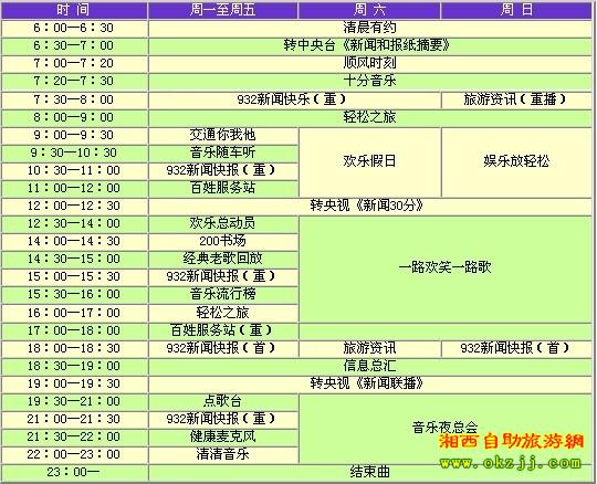 張家界旅游交通頻道茲定于四月八號(hào)試播,頻率為FM93.2兆赫和103.2兆赫。頻道以立足旅游交通、服務(wù)百姓大眾為宗旨,設(shè)置了《清晨有約》、《順風(fēng)時(shí)刻》、《932新聞快報(bào)》、《輕松之旅》、《交通你我他》、《百姓服務(wù)站》、《歡樂(lè)總動(dòng)員》和《音樂(lè)隨車(chē)聽(tīng)》等欄目。屆時(shí),聽(tīng)眾可以通過(guò)熱線(xiàn)電話(huà)、短信平臺(tái)以及網(wǎng)絡(luò)廣播等多種途徑參與到電臺(tái)節(jié)目中來(lái),在第一時(shí)間了解新聞動(dòng)態(tài),掌握市場(chǎng)信息,享受娛樂(lè)休閑。 直播熱線(xiàn):0744——2116999 熱線(xiàn)電話(huà):0744——2116777 廣告熱線(xiàn):0744——8235800 地址:張家界是永定區(qū)廣電局四樓(解放路27號(hào)) 怎樣收聽(tīng)張家界旅游交通頻道FM93.2